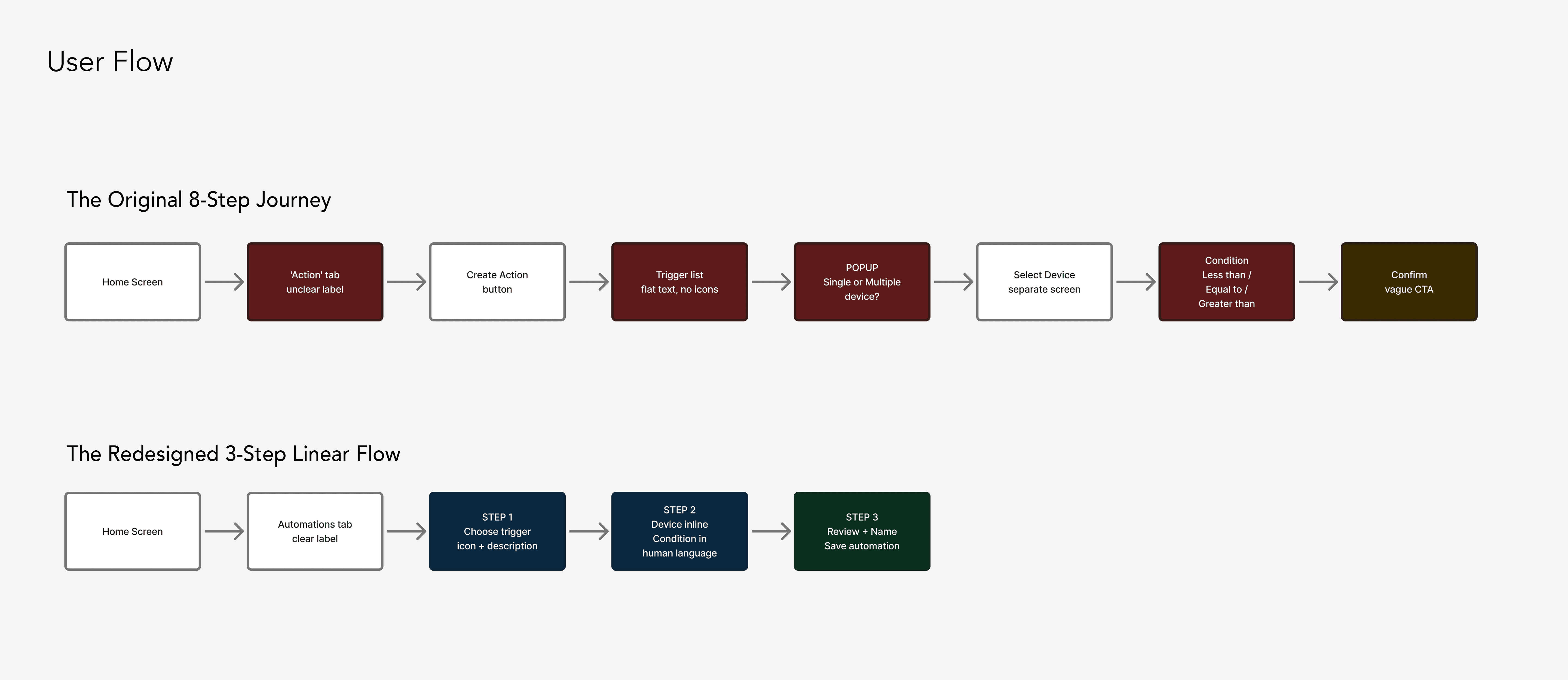 The original 8-step automation flow was exhausting for users. Due to vague labels, no visual cues, and technical jargon, setting a schedule was a chore. I redesigned this into a 3-step flow by asking one question per screen. This new approach eliminates pop-ups and dead ends while keeping the user’s progress visible at all times.