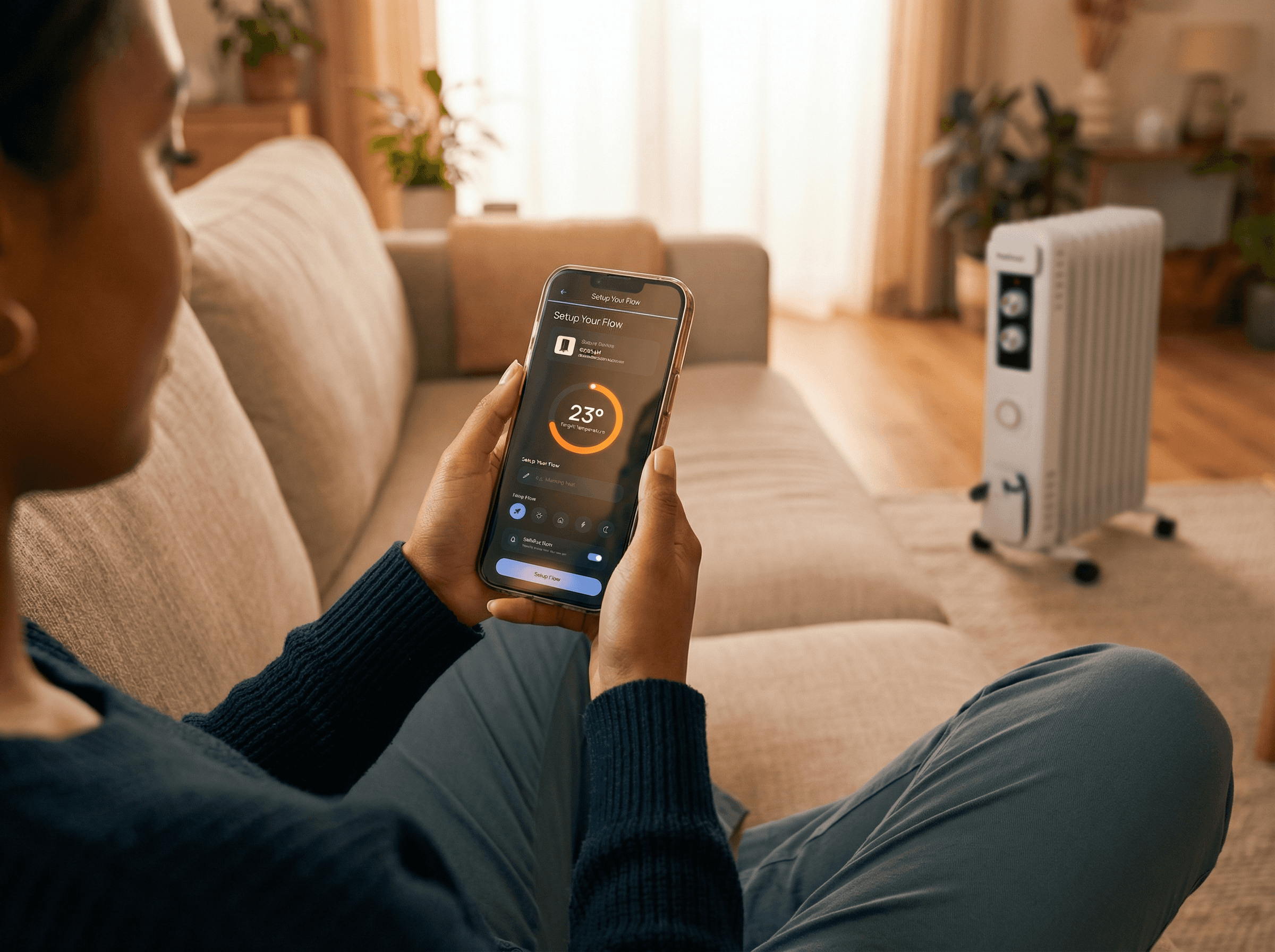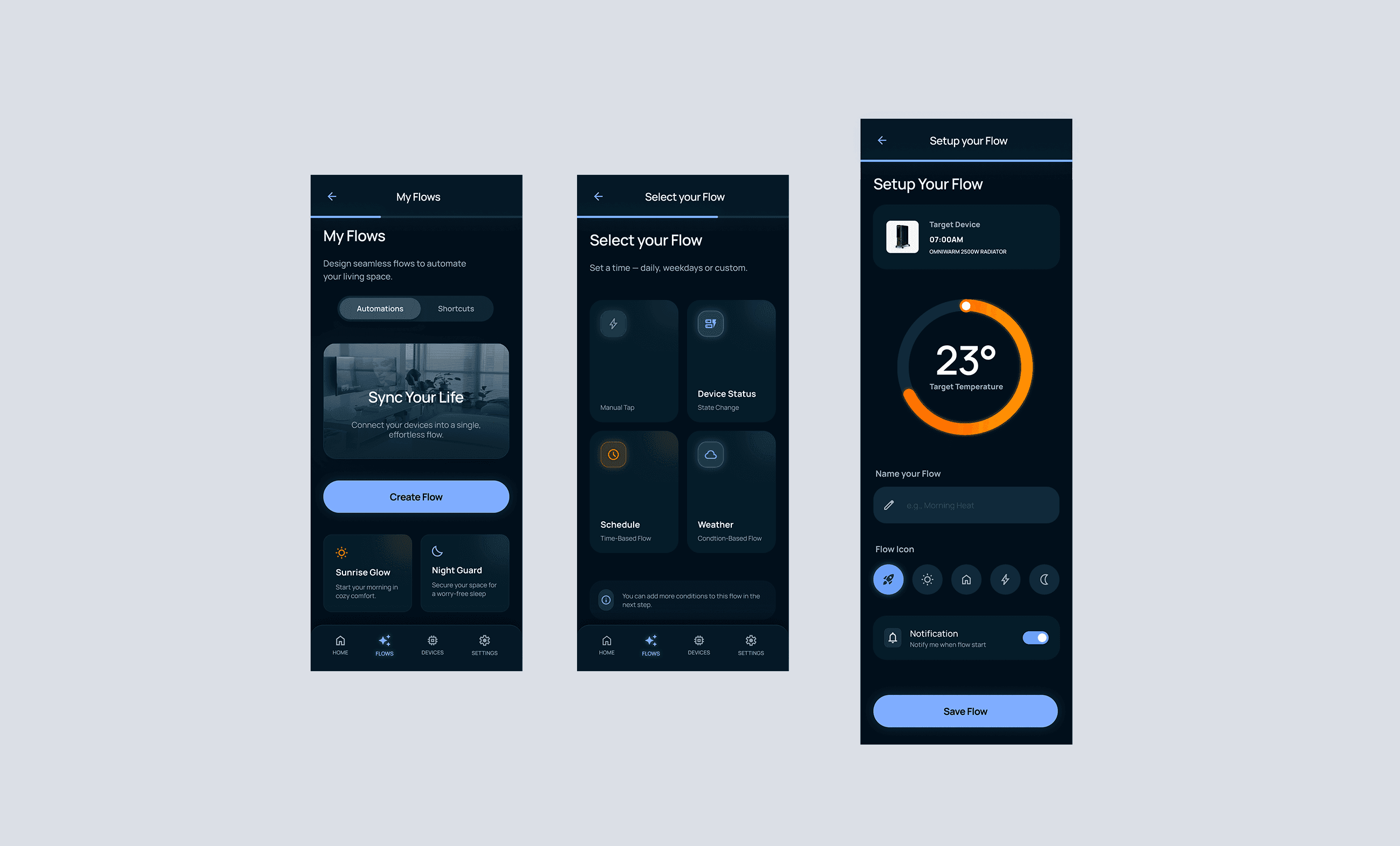 This is where the most significant UX shift happens. Instead of asking users to choose between abstract operators like "Less than" or "Equal to," the redesign introduces a tactile temperature wheel — a large, draggable arc that displays the target temperature as a bold, readable number at the centre. The selected device appears as an inline card at the top, confirming context without a separate step. Below the wheel, users can name their flow, choose an icon, and toggle notifications — all in one place. The "Save Flow" CTA closes the journey cleanly.