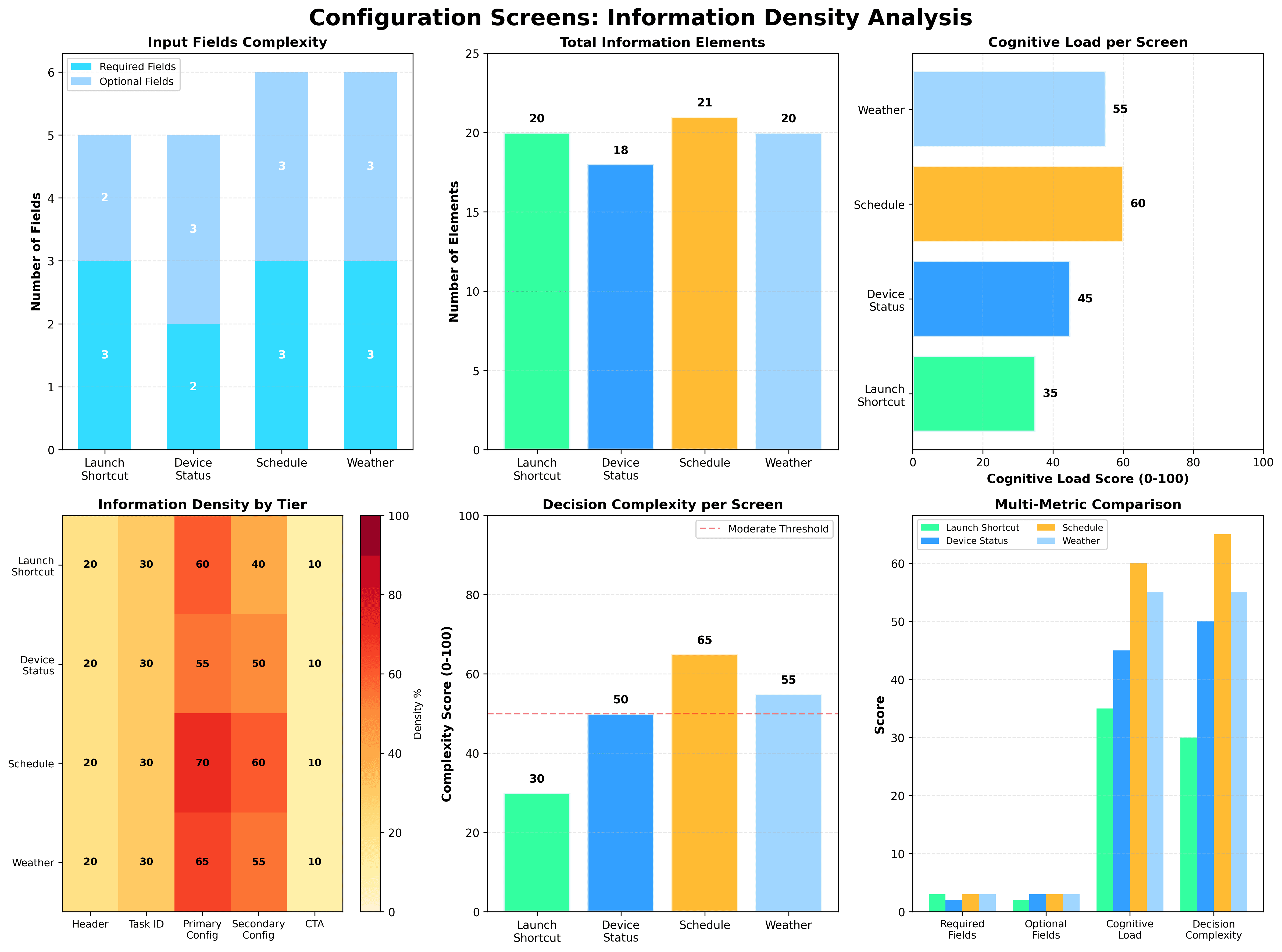The results confirmed it. The Schedule and Weather flows scored 60/100 and 55/100 on Cognitive Load, and 65/100 and 55/100 on Decision Complexity — both well above the moderate threshold. The culprit? The Primary and Secondary Configuration tiers, where users are hit with too many technical input fields at once, in a single view, with no guidance on what matters most.