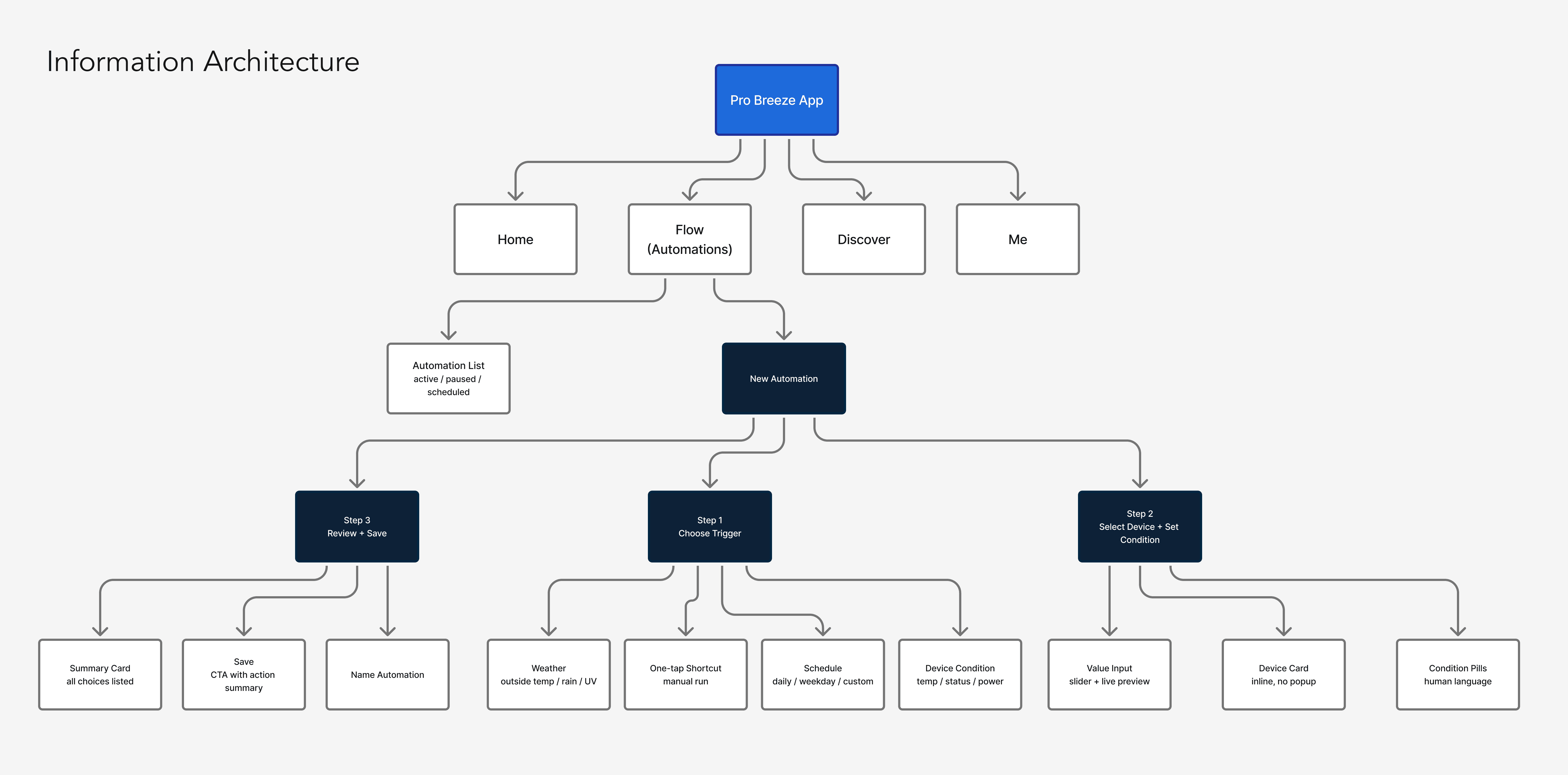 The IA diagram shows where the scheduling flow sits within the broader app structure, and how the internal hierarchy of the New Automation flow was restructured.