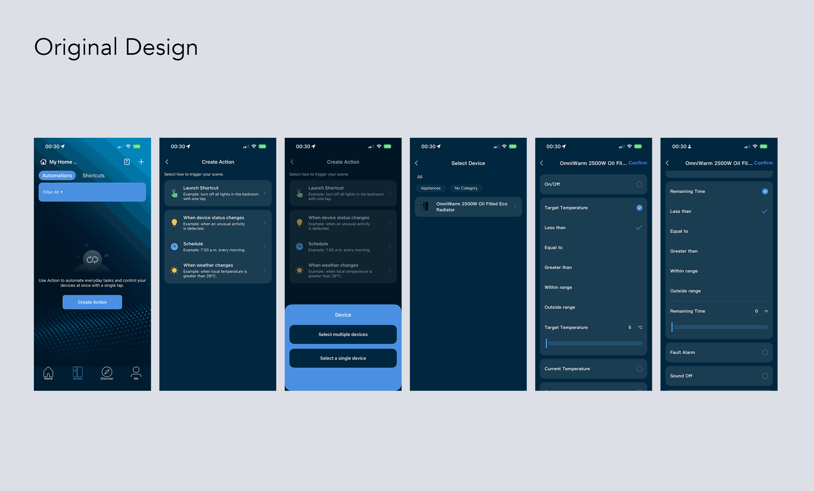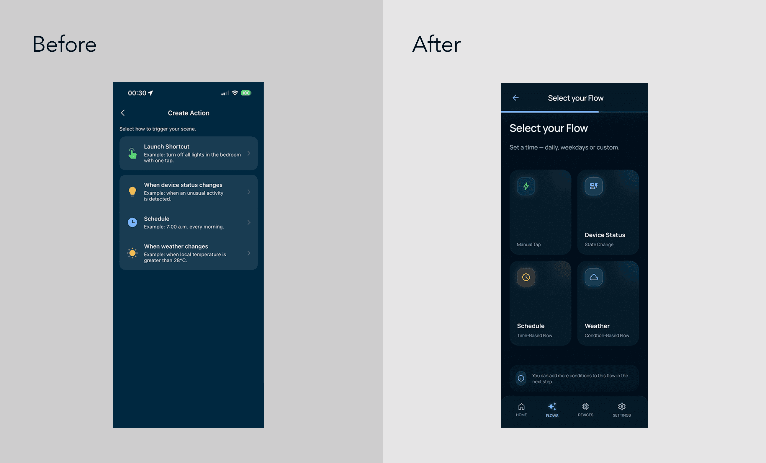 Where the original app presented a flat, ambiguous list, the redesign offers four large icon-driven cards — Manual Tap, Device Status, Schedule, and Weather — each with a one-line description beneath it. The options map directly to how users actually think about automation: "I want it to run on a timer" or "I want it to react to the weather." The cognitive work of interpreting technical labels is gone. You see it, you tap it.